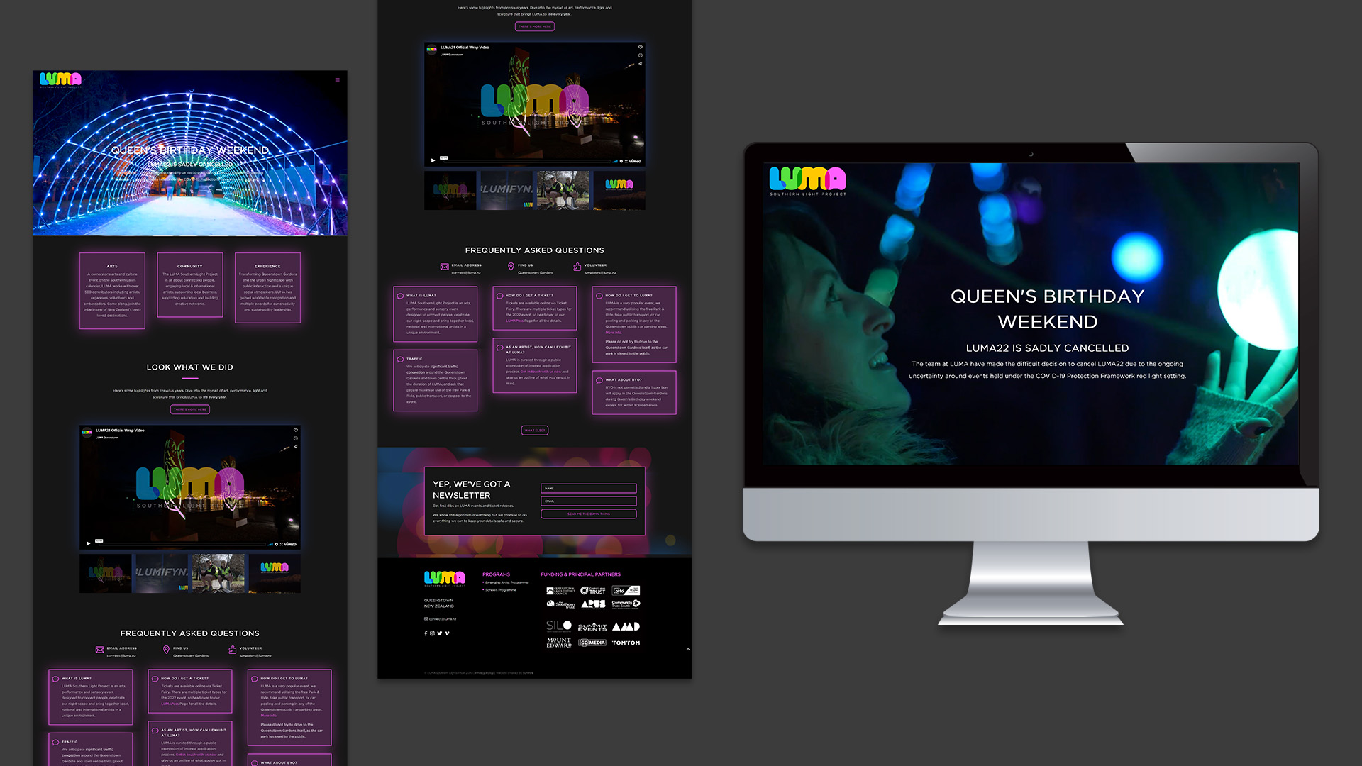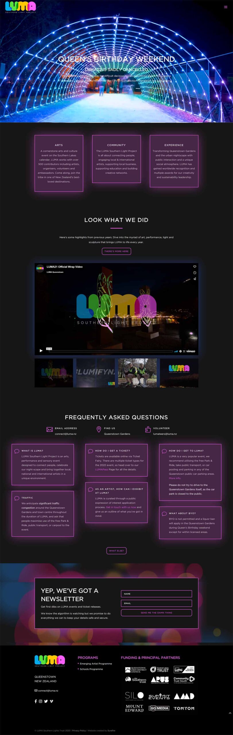 A community-led light festival held in the Queenstown Gardens, LUMA needed a site that felt as creative and atmospheric as the event itself. The design uses a dark colour palette with glow effects to echo the experience of walking through the installations at night.